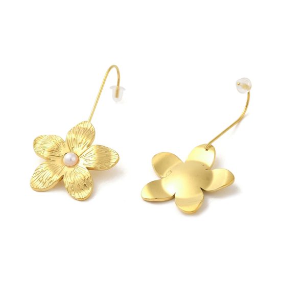 304 Stainlee Steel with Plastic Pearl Dangle Earring, Flower, Real 18K Gold Plated, 45x25mm