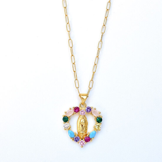 Ατσάλινο επίχρυσο κολιέ με μοτίφ την παρθένα Μαρία -Παναγία , σε σχήμα καρδία και πολυχρωμα ζιργκόν κρύσταλλα.