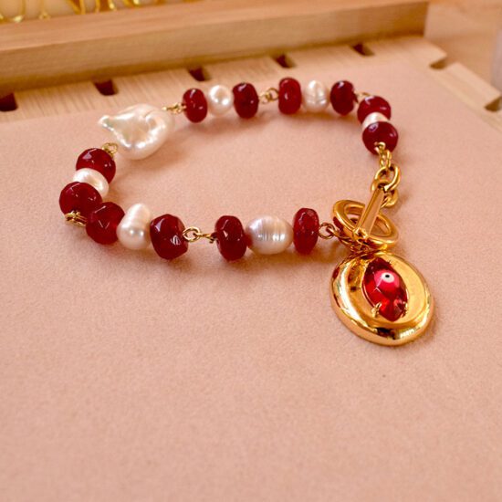 Ένα κομψό χειροποίητο βραχιόλι που ενώνει τη δύναμη του κόκκινου αχάτη με τη διαχρονική κομψότητα των φυσικών μαργαριταριών. Ο deep red agate είναι λίθος που συμβολίζει τη ζωτικότητα, την προστασία και το πάθος, ενώ το μαργαριτάρι εκφράζει αγνότητα και θηλυκότητα. Μαζί δημιουργούν έναν εκλεπτυσμένο συνδυασμό, ιδανικό για να χαρίσει ισορροπία και λάμψη σε κάθε εμφάνιση.