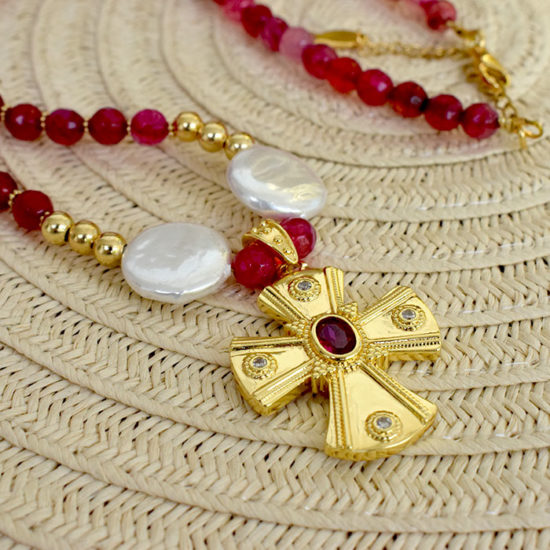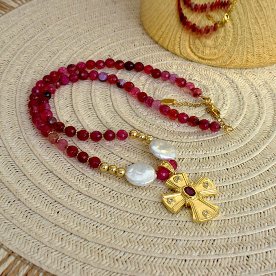 Κολιέ με βυζαντινό Σταυρό και χάντρες αχάτη μπορντώ
