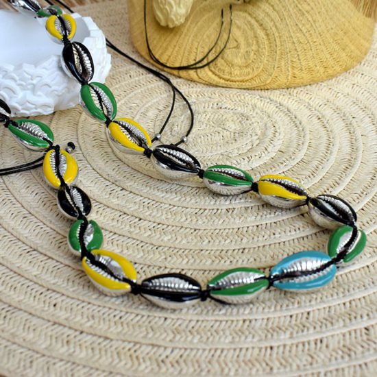 Κολιέ τσόκερ κοχύλια με σμάλτο ασημί BLACK YELLOW GREEN
