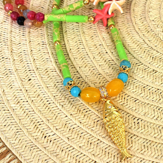 Μακρύ κολιέ χάντρες Ιασπις-Αχάτη και μενταγιόν επίχρυσο ψαράκι