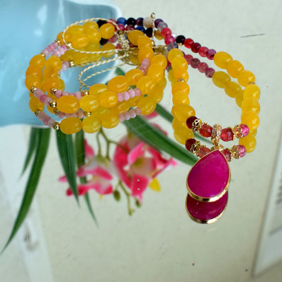 Με χάντρες νεφρίτη 8~9 mm , πορτοκαλί , μπορντώ και φούξια μενταγιόν δάκρυ.