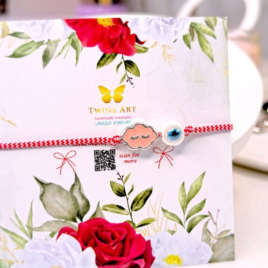 Χαριτωμένο και διαχρονικό μαρτάκι, σχεδιασμένο για να φοριέται καθημερινά με άνεση και ασφάλεια. Διαθέτει διακοσμητικό στοιχείο συννεφάκι από σμάλτο σε απαλό ροζ χρώμα και ματάκι, δεμένα με κόκκινο–λευκό κορδόνι που προσαρμόζεται εύκολα στον καρπό.