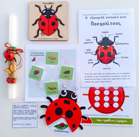 ( κύκλο ζωής της Πασχαλίτσας, κάρτες με τον κύκλο ζωής και αντιστοίχιση, ανατομία πασχαλίτσας, μαθηματικά – γράφω προσθέσεις και αφαιρέσεις σε πλαστικοποίηση για να γράφετε και να σβήνετε όσες φορές θέλετε).