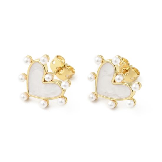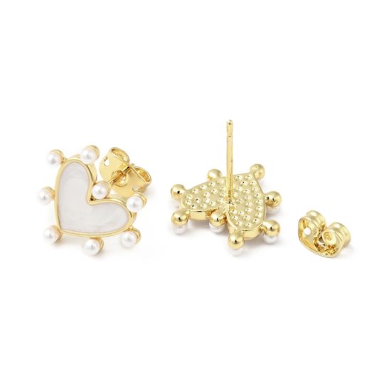 Rack Plating Brass Enamel Stud Earrings for Women, with Acrylic Beads and Ear Nuts, Cadmium Free & Lead Free, Heart, Real 18K Gold Plated…