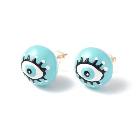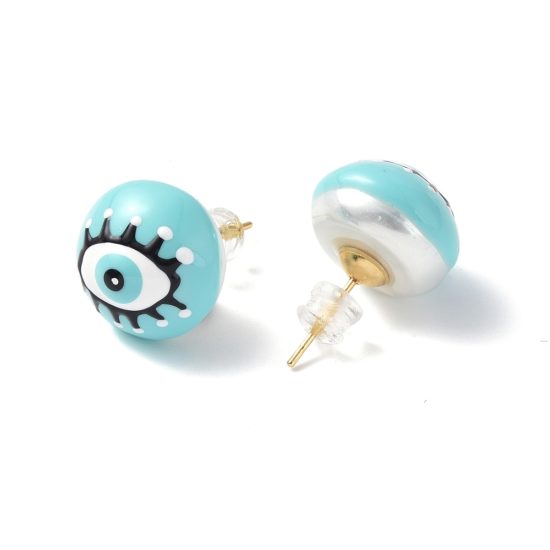 Natural Shell Eye Stud Earrings with Enamel, Real 18K Gold Plated Brass Jewelry for Women, Cyan, 15mm, Pin: 0.8mm